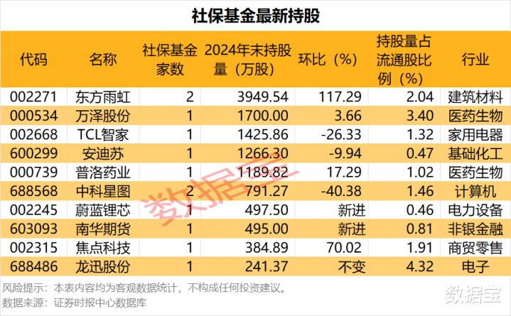 从前十大流通股东名单中社保基金家数来看,东方雨虹、中科星图均有2家社保基金集中现身,持股量分别为3949.54万股、791.27万股。