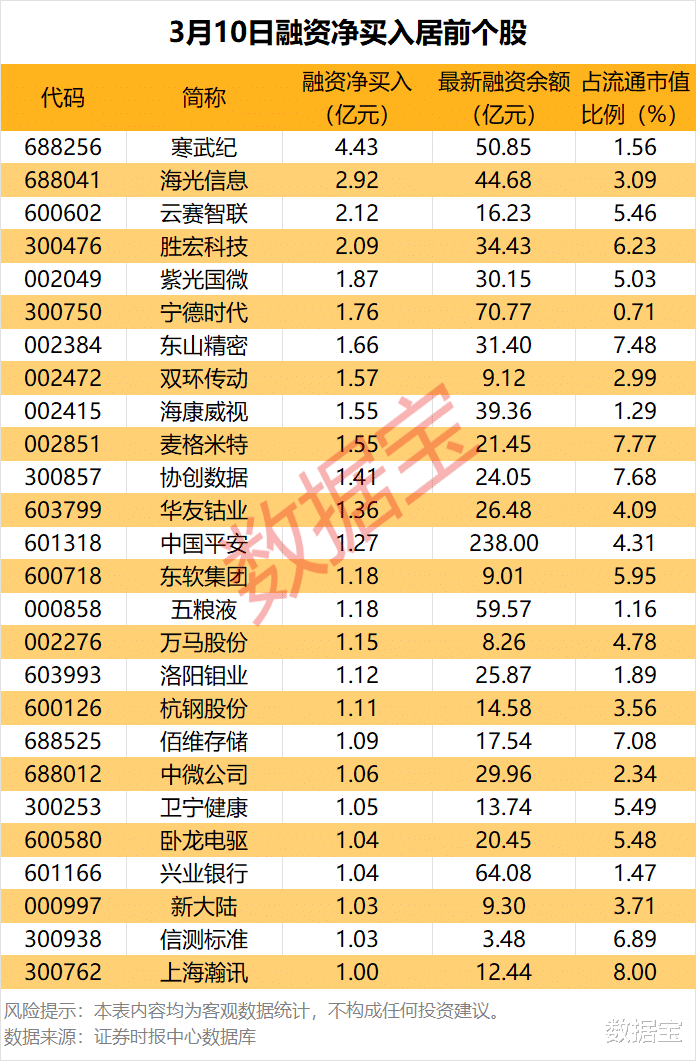 具体到个股,3月10日共有26只股融资净买入额超亿元。寒武纪融资净买入额居首,当日净买入4.43亿元,其次是海光信息、云赛智联,融资净买入金额分别为2.92亿元、2.12亿元,融资净买入金额居前的还有胜宏科技、紫光国微、宁德时代等。