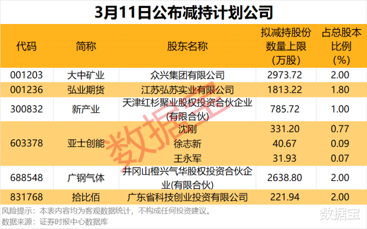 3月11日共有6家公司披露股东减持计划,拟减持股份比例居前的有大中矿业、广钢气体、拾比佰等。